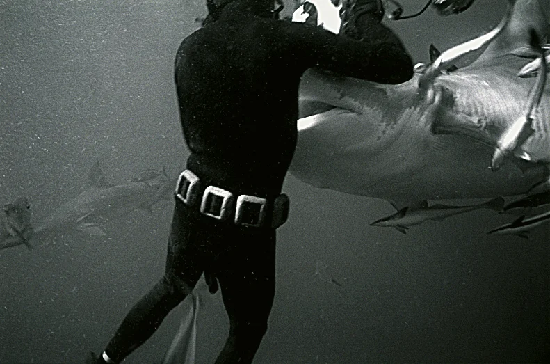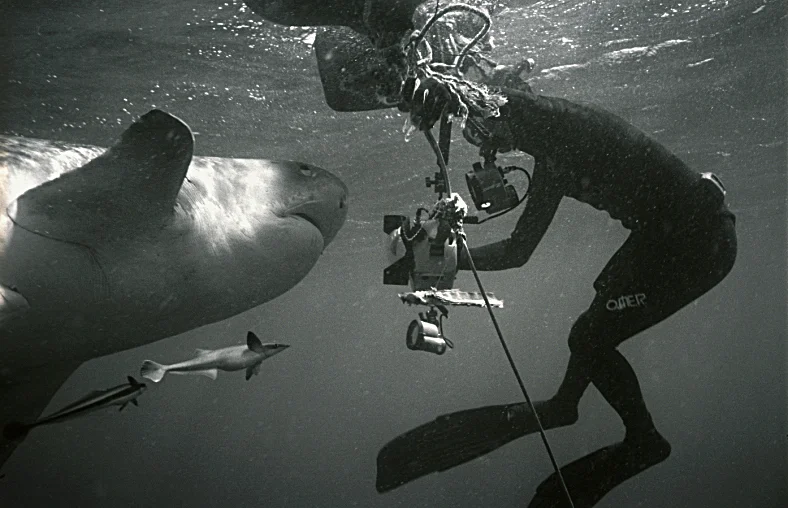 My dad always said you need to get close to your subjects...Thomas Peschak with Tiger Shark in South Africa. Photo by Wolfgang Leander 2007