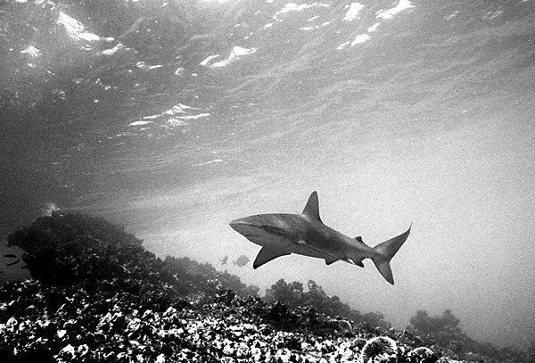 The same is true of flash: No flash for me, just available light. Sharks don't like flash anyway, especially when you (or they) get really close. I still cling to film as I believe that digital photography with its endless technical possibilities takes away the mystique of photographing.